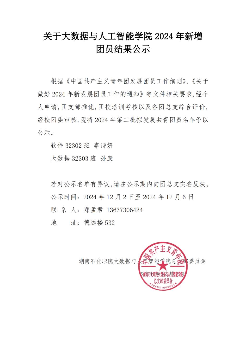 关于大数据与人工智能学院2024年新增团员结果公示