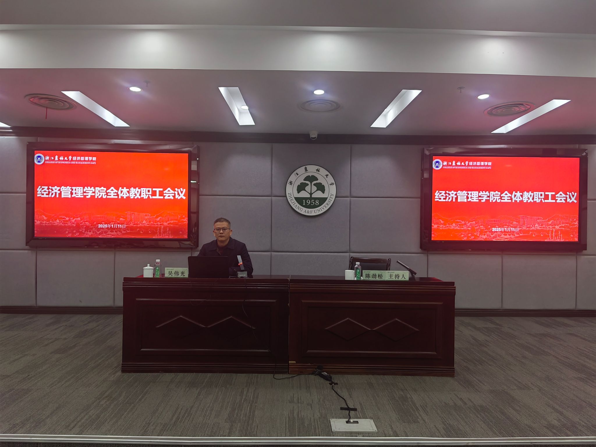 经管学院召开全体教职工大会 1月11日下午,学院在东湖校区图书馆第二报告厅召开全体教职工大会,学院全体教职工参加了会议,会议由党委书记陈劲松主持。吴伟光院长作了学院2024年度工作报告。他从党建思政、本科教育教学、师资队伍和学科平台建设四个方面总结了2024年学院发展成绩,并提出了2025年主要努力方向。他指出2024年学院各项工作有条不紊,亮点纷呈。他从三个方面对25年工作提出了要求,希望全体教师一要树立强大信心,集体蓄能向上;二要打破思想... 12 2025-01