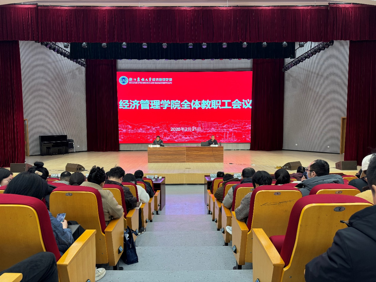 学院召开全体教职工大会 2月21日下午,学院在衣锦报告厅召开新学期全体教职工大会。学院领导班子成员及全体教职工参加会议。大会由党委书记陈劲松主持。院长吴伟光分析了当前学院发展态势,强调大家要有充分的自信和忧患意识,并提出三点要求,一是眼光朝外找准自己的方位,二是积极谋划主动作为,三是守牢底线突出重点。他指出学院量质齐升的教师队伍是学院高水平发展的最大底气,要抓好人才引进窗口期,用好柔性引人政策,扎实推进学院各项工作,为学...