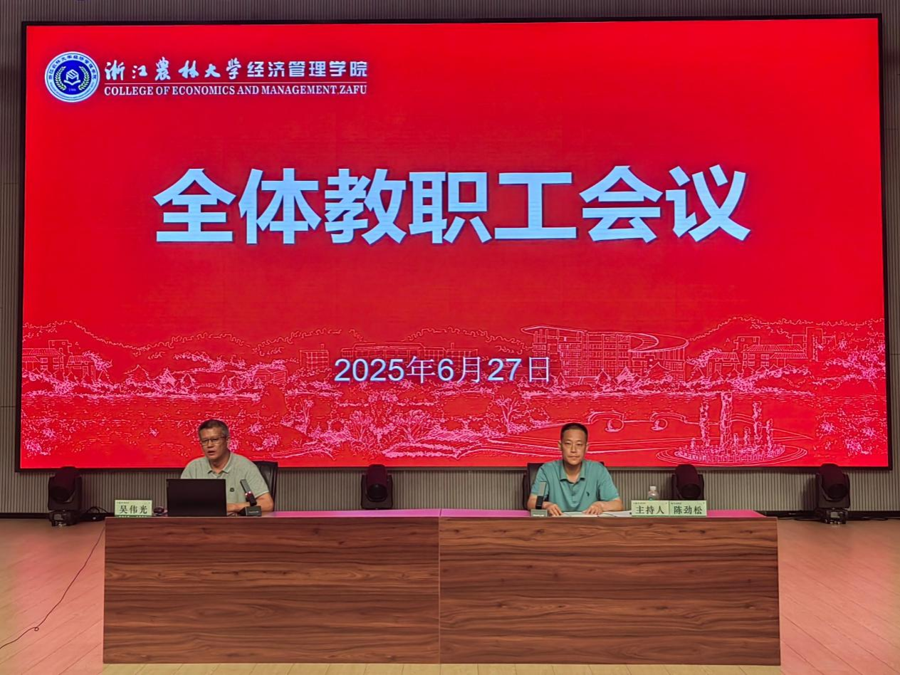经管学院召开全体教职工大会 6月27日下午,学院在衣锦校区报告厅召开全体教职工大会。学院全体教职工参加了会议,会议由党委书记陈劲松主持。院长吴伟光指出,2025年是“十四五”收官之年和“十五五”谋篇布局之年,学院要重点做好三方面工作:一是重视人才和团队建设,强化有组织科研,聚焦乡村振兴、数字经济等国家战略需求,打造高水平创新团队;二是夯实教学根基,加强基层教学组织建设,充分发挥课程组、教学团队在教学质量提升中的关键作用,全面提升...