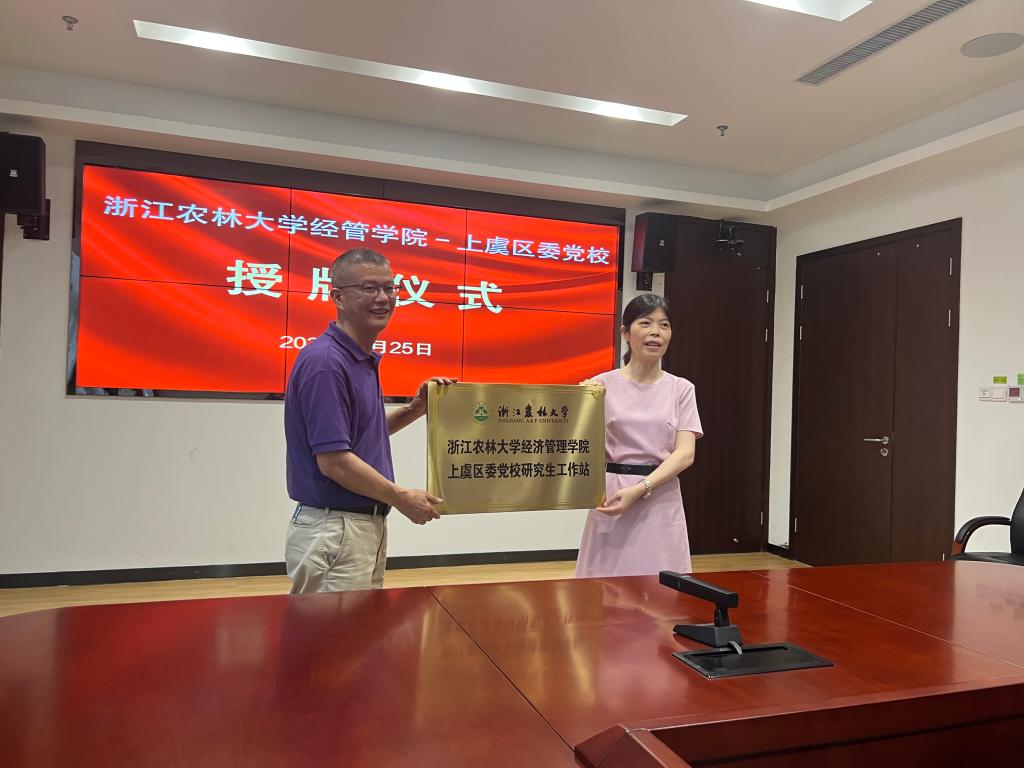 随后,学院和研究院负责人与上虞区委党校负责人举行了“浙江省乡村振兴研究院上虞区委党校研究基地”和“太阳成集团tyc33455cc官网上虞区委党校研究生工作站”授牌仪式,并为校外实践导师颁发了聘书。双方还就具体合作内容和工作推进机制等方面进行了深入沟通交流,初步达成了一致意见。