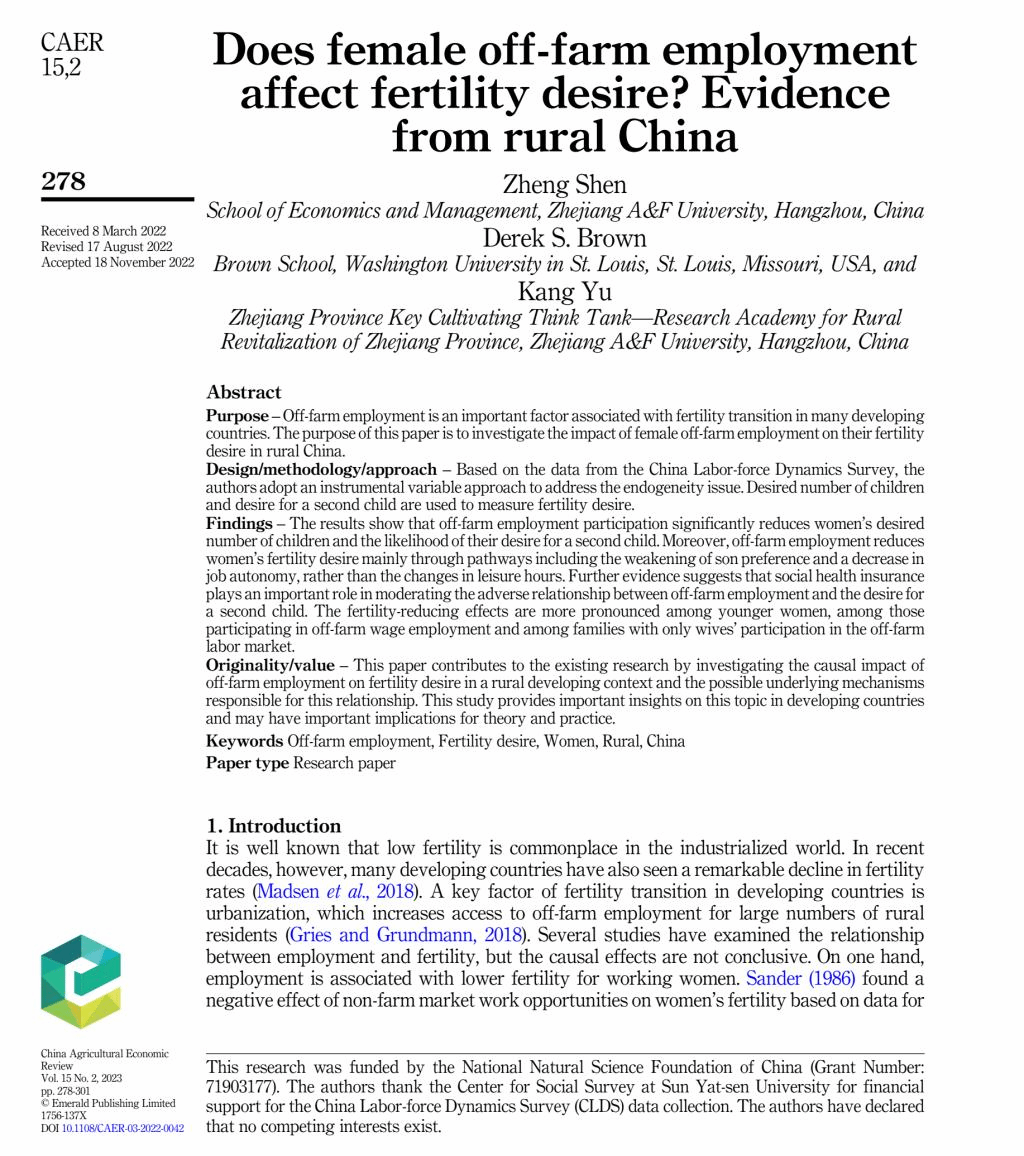 近日,由太阳成集团tyc33455cc官网沈政副教授和余康教授等人合作撰写的论文《Does female off-farm employment affect fertility desire? Evidence from rural China》在SSCI/SCI期刊《China Agricultural Economic Review》(经济学领域:JCR一区,农业经济与政策领域:JCR二区)发表。