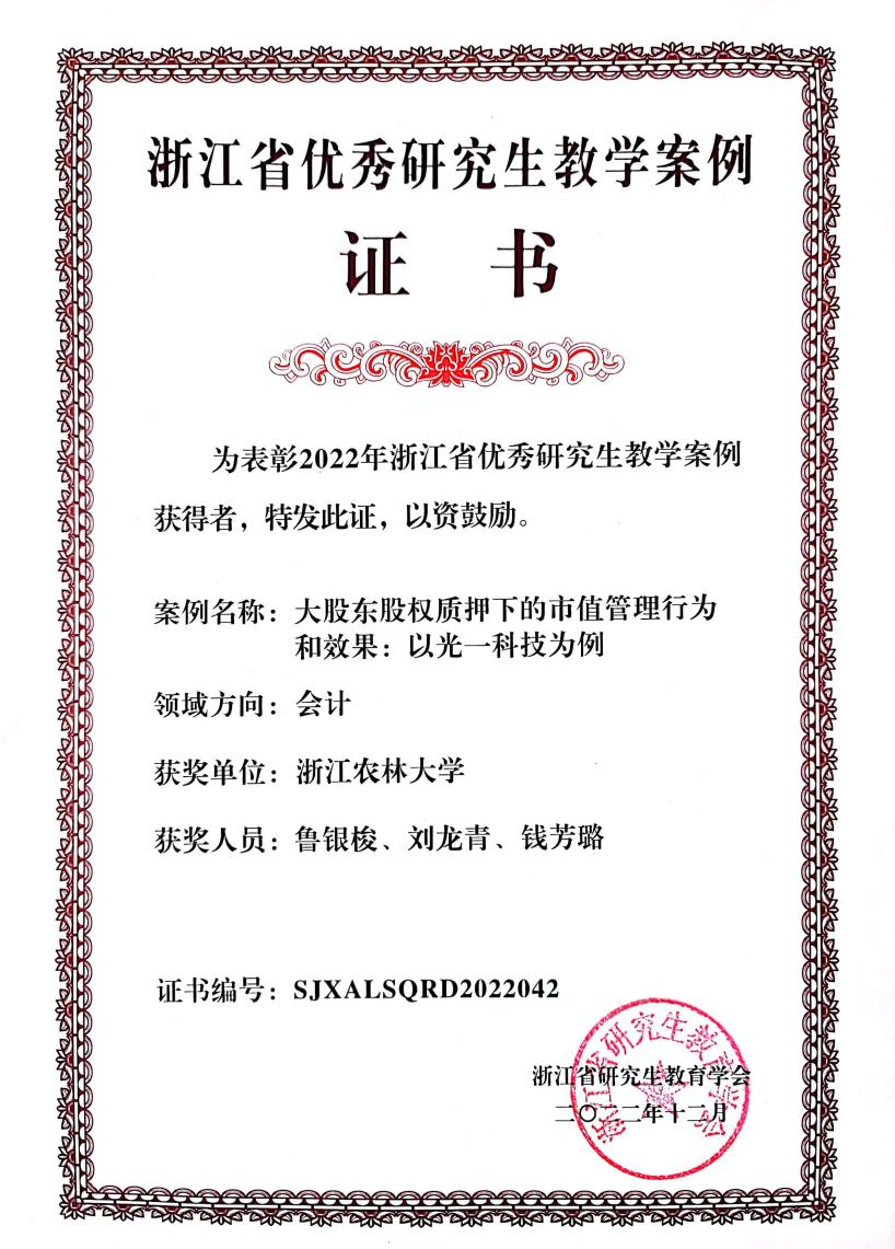 日前,浙江省研究生教育学会组织开展了2022年全省优秀研究生优秀教学案例认定工作,并于近日公布了“2022年浙江省优秀研究生教学案例”最终认定名单,太阳成集团tyc33455cc官网共有5篇案例入选,其中“刘龙青名师工作室”成员鲁银梭和负责人刘龙青两位老师合作撰写的案例《大股东股权质押下的市值管理行为和效果:以光一科技为例》入选。工作室不定期开展教学研讨工作,鼓励师生理论联系实际,深入企业开展原创案例研究。