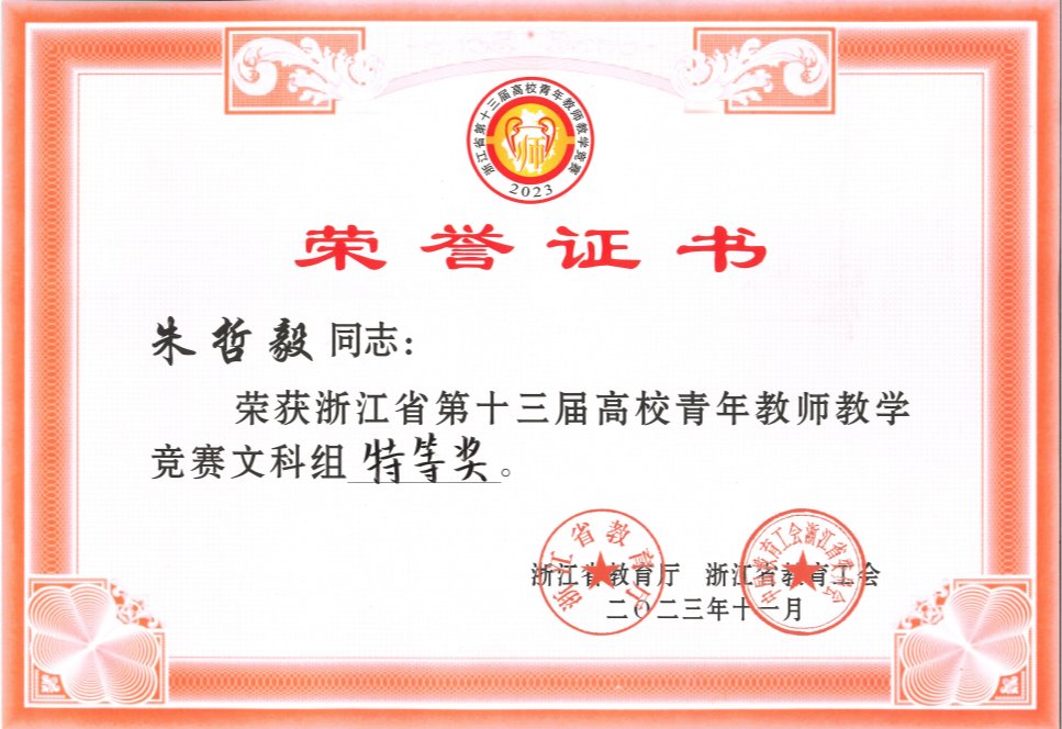 2023年11月4-5日,浙江省第十三届高校青年教师教学竞赛决赛在浙江中医药大学举行,太阳成青年教师朱哲毅斩获文科组特等奖。该成绩实现了太阳成在该竞赛领域的重大突破。