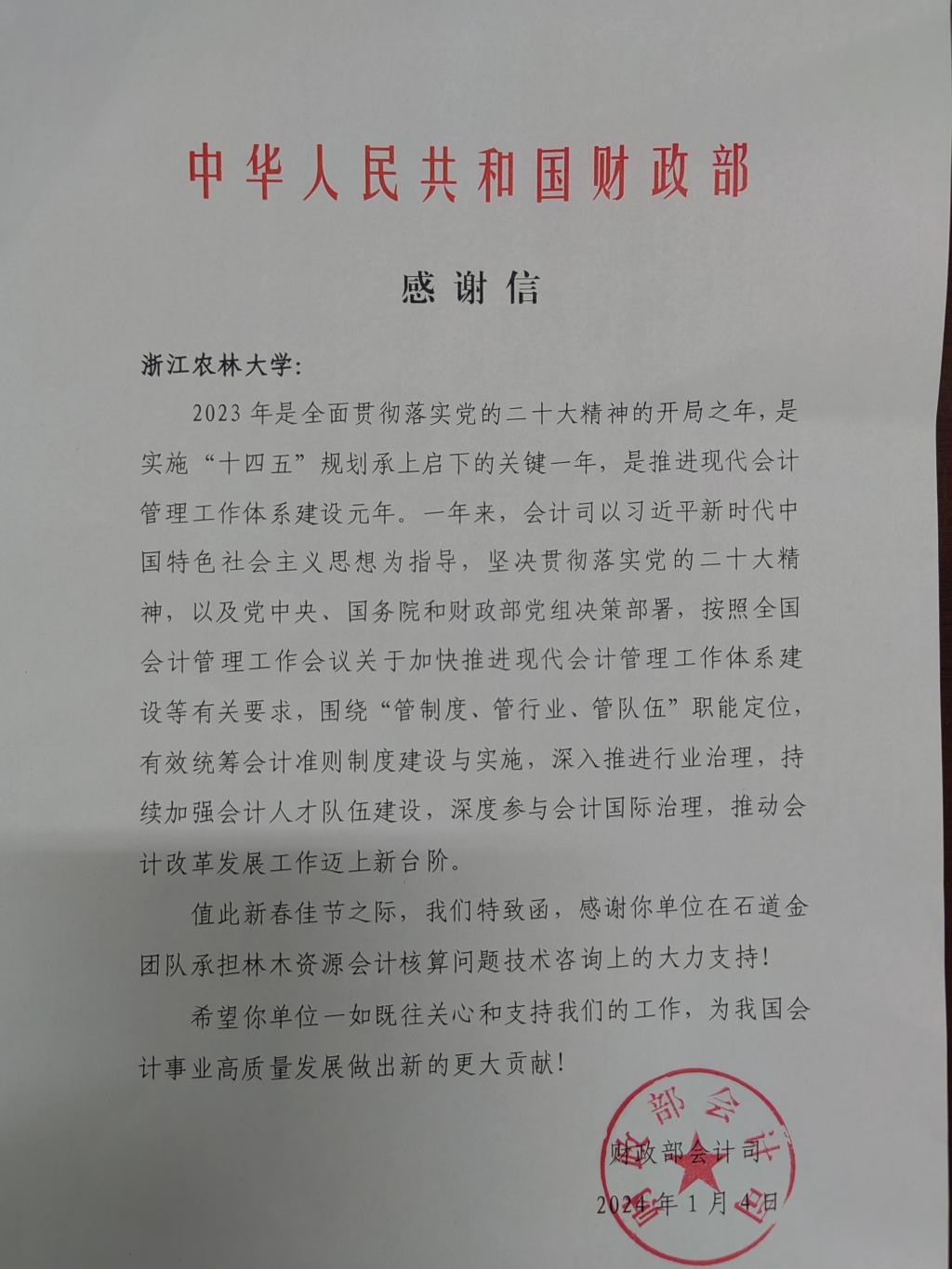日前,财政部会计司专门给我校发来感谢信。信中高度肯定了太阳成石道金教授团队在财政部会计司工作中克难攻坚、勇挑重担,对推进现代会计管理工作体系建设过程中做出的辛勤付出表示了充分肯定。并对太阳成围绕中心、服务大局,积极推动会计改革发展工作做出的突出贡献表达了诚挚谢意。