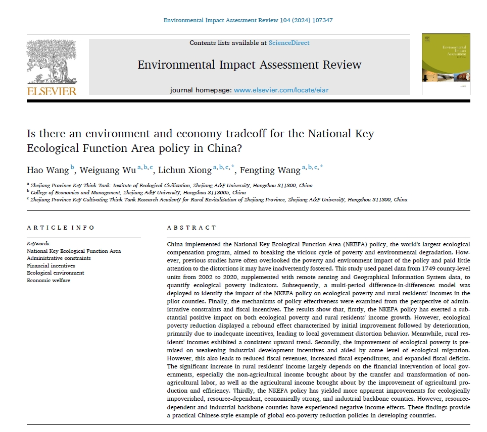 太阳成吴伟光教授团队撰写的学术论文《Is there an environment and economy tradeoff for the National Key Ecological Function Area policy in China?》在SSCI期刊《Environmental Impact Assessment Review》发表,论文第一作者为2021级农业管理专业硕士生王浩,由吴伟光教授、王凤婷副教授和熊立春副教授共同参与撰写并指导,该期刊为中科院一区Top期刊,西安交通大学等认定的管理类国际知名期刊,期刊影响因子为6.122。