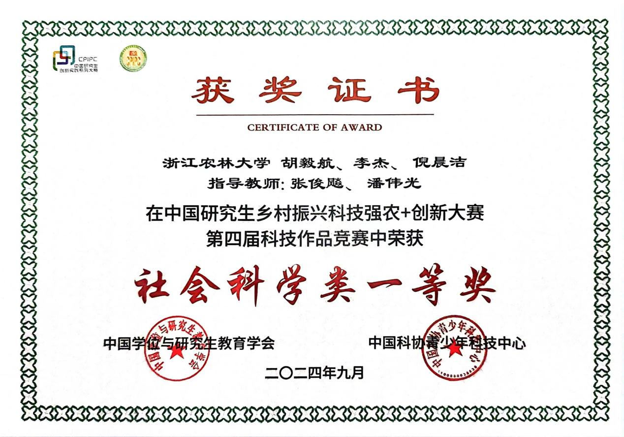 9月26日,经管学院胡毅航、李杰、倪晨洁3名硕博研究生作品《丹江口市生态文明建设与文化适应之鉴》,荣获中国研究生乡村振兴科技强农+创新大赛第四届科技作品竞赛一等奖。该项目由张俊飚教授、潘伟光教授共同指导,两位教师荣获优秀指导教师称号。