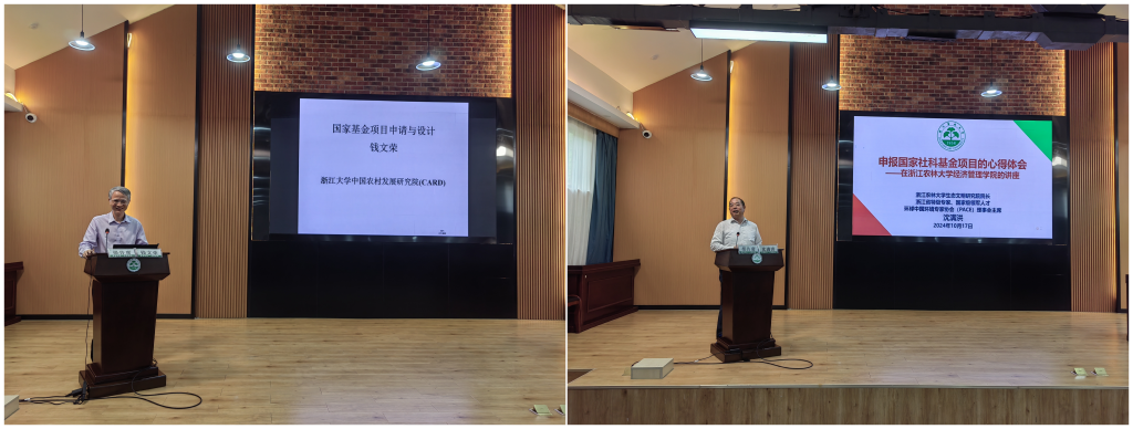 会议邀请了浙江大学公共管理学院副院长、中国农村发展研究院院长钱文荣教授和生态文明研究院院长兼首席专家沈满洪教授分别做了《国家基金项目申请与设计》和《申报国家社科基金项目的心得体会》专题辅导报告;朱臻副院长就基金申报情况及学院辅导计划进行了说明。