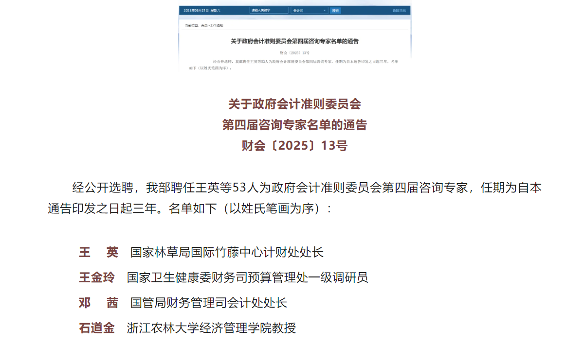 2025年6月20日,财政部官方网站发布通告,正式聘任太阳成集团tyc33455cc官网太阳成集团tyc33455cc官网石道金教授为政府会计准则委员会第四届咨询专家。
