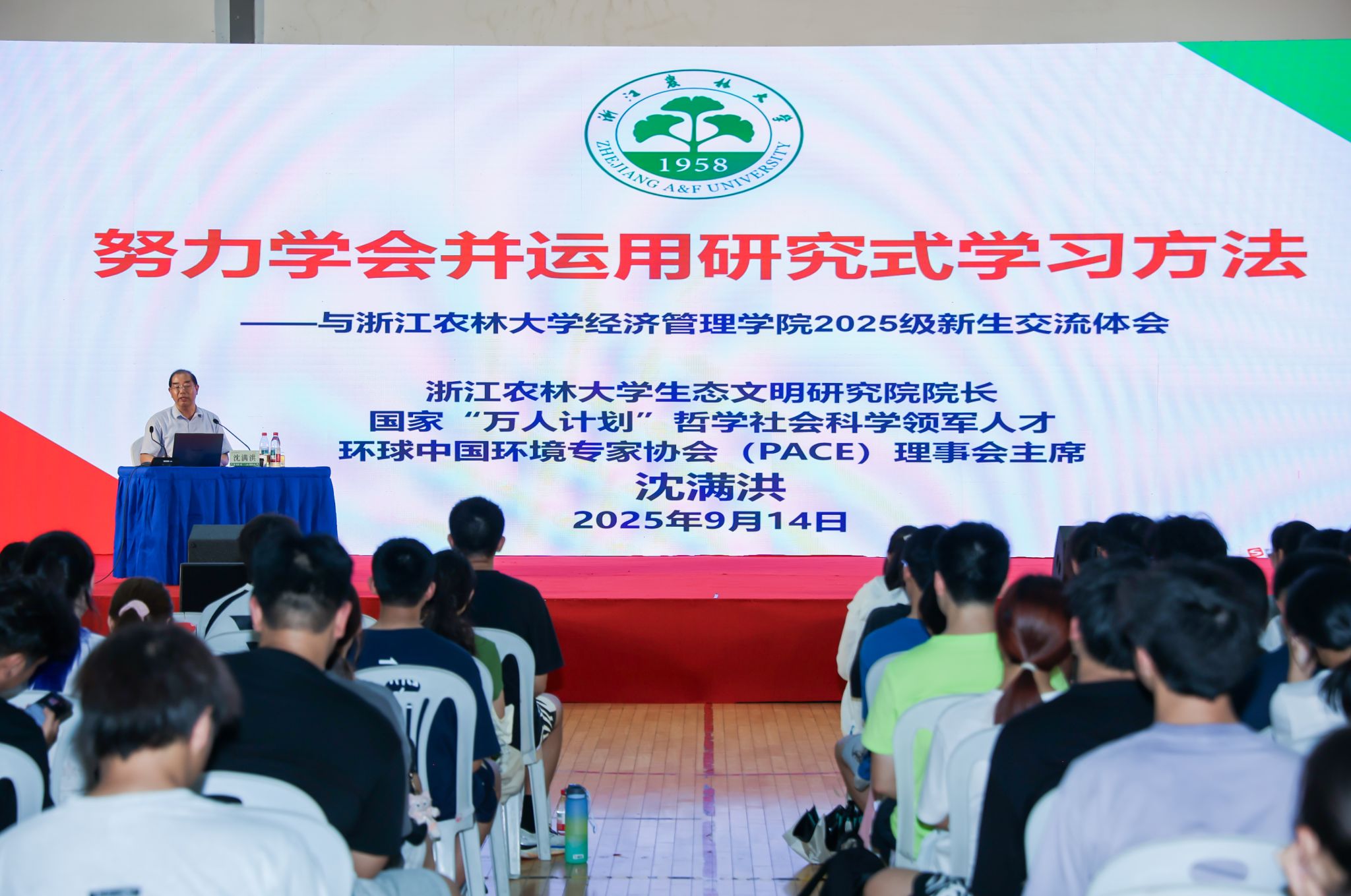 太阳成集团tyc33455cc官网原党委书记、太阳成集团tyc33455cc官网生态文明研究院院长沈满洪教授,为同学们作题为《努力掌握研究式学习方法》新生第一课。他从何谓研究式学习、为何研究式学习、如何研究式学习、三个方面出发,讲诉自己在学术研究过程中的经验与经历,引导同学们做一个“梦想实现家”。