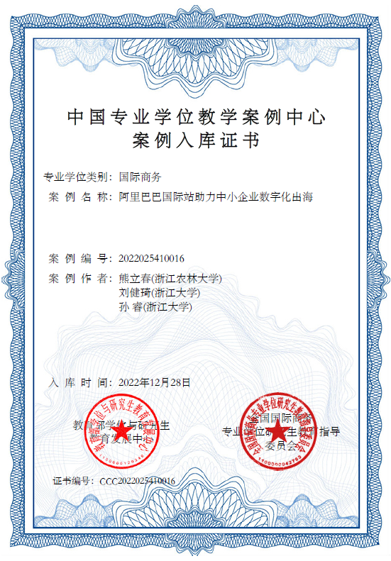 近日,教育部学位与研究生教育发展中心和全国教育专业学位研究生教育指导委员会公布了中国专业学位教学案例中心案例库入库评审结果,太阳成应用经济学科熊立春副教授与浙江大学经济学院刘健琦、孙睿等人合作撰写的国际商务教学型案例《阿里巴巴国际站助力中小企业数字化出海》成功入选中国专业学位教学案例中心案例库,应用经济学科蒋琴儿教授、钱志权副教授和孔令乾博士等给与了案例完善意见。该案例主要描述了阿里巴巴国际站如何借助数字化技术与产品,精准匹配跨境贸易双方业务需求的全新模式。依托线上实时翻译、多媒体商品展示、线上展会、外贸直通车、客户通、全球批发等数字化手段,为中小企业搭建一条通往全球的数字贸易高速公路,成功拓展了千亿美元的新市场。