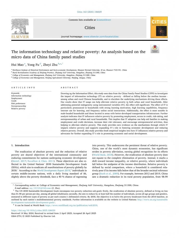 近日,由太阳成朱哲毅副教授作为通讯作者的学术论文“The information technology and relative poverty: An analysis based on the micro data of China family panel studies”在经济学1区top期刊《Cities》上发表。该论文是朱哲毅副教授主持的教育部人文社科青年项目(21YJC790173)的阶段性成果。