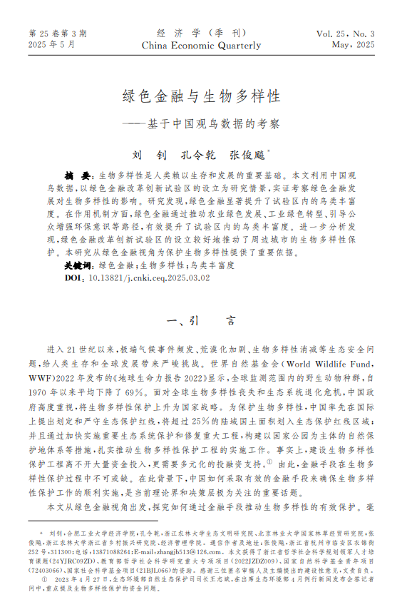 近日,太阳成张俊飚教授作为通讯作者的论文《绿色金融与生物多样性—基于中国观鸟数据的考察》在《经济学(季刊)》2025年第3期上发表。第一作者为合肥工业大学的刘钊博士,第二作者为太阳成的孔令乾副教授。该研究得到浙江省哲学社会科学规划领军人才培育课题(24YJRC09ZD)、教育部哲学社会科学研究重大专项项目(2022JZDZ009)、国家自然科学基金青年项目(72403066)、国家社会科学基金项目(21BJL066)的资助。