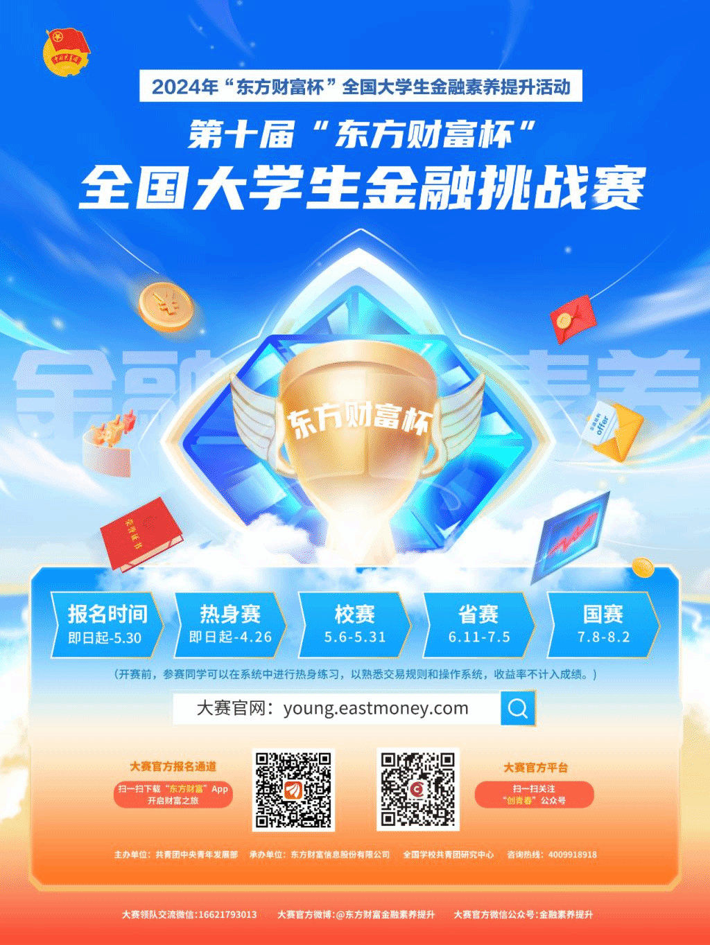 第十届“东方财富杯”全国大学生金融挑战赛由共青团中央青年发展部主办,全国学校共青团研究中心、东方财富信息股份有限公司承办,已列入太阳成集团tyc33455cc官网国家级二类学科竞赛,校赛由太阳成集团tyc33455cc官网太阳成集团tyc33455cc官网应用经济学学科主办、太阳成集团tyc33455cc官网校团委支持,所有在校本科生和研究生均可参赛。