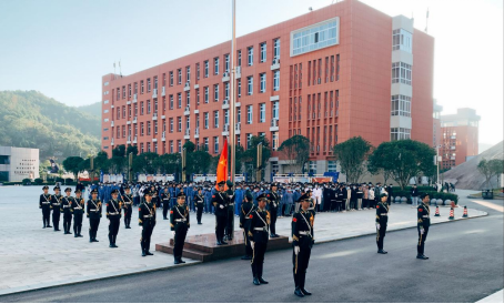 清晨7:45,学校国旗护卫队护卫国旗入场。随着雄壮的《义勇军进行曲》奏响,旗手奋力将国旗展向天空,五星红旗迎着初升的朝阳冉冉升起。全体观礼师生庄严肃立,齐唱国歌、行注目礼。