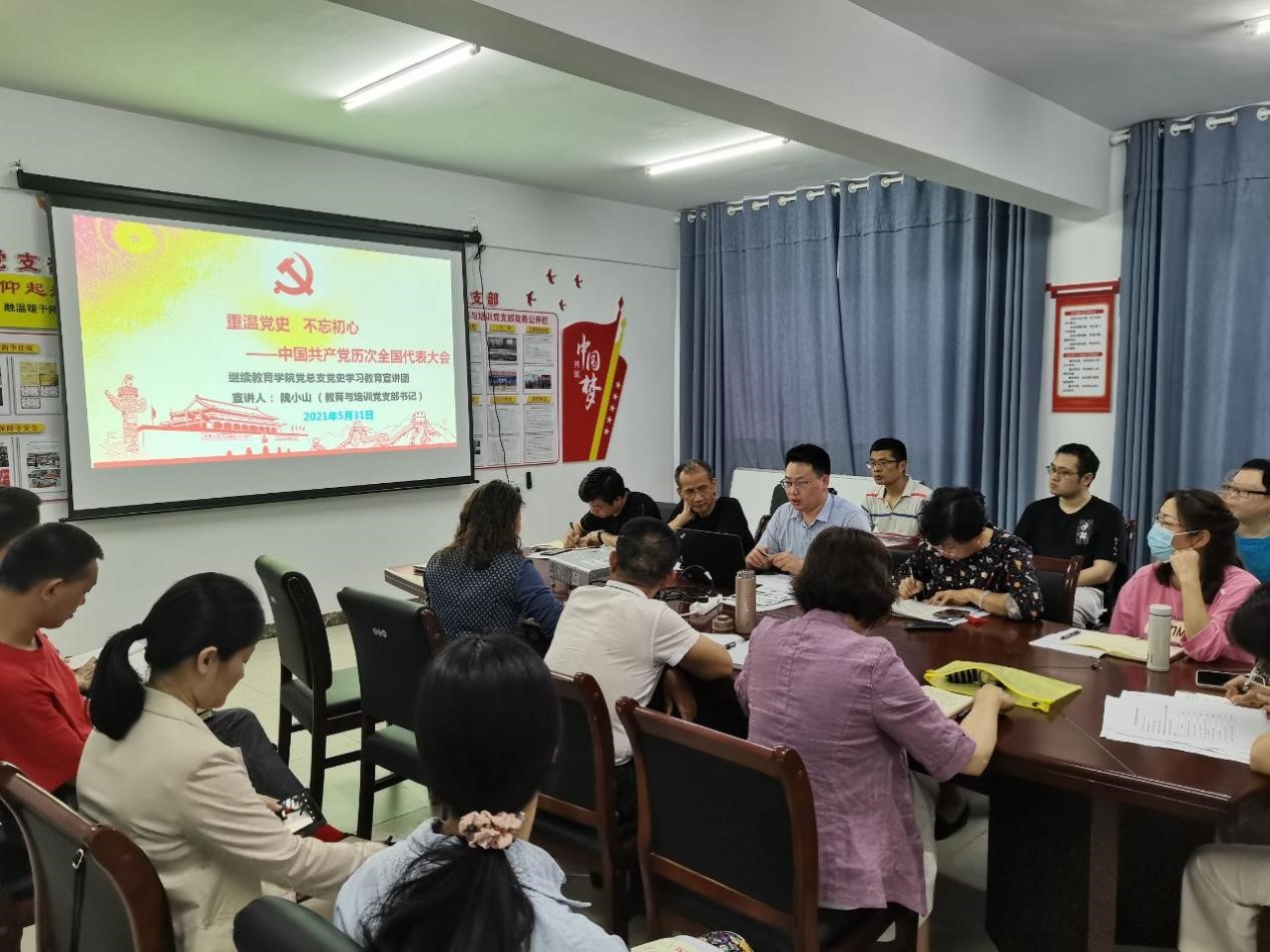 (通讯员 黄丹群)为高标准、高质量开展好党史学习教育,扎实推进学校党委关于党史学习教育的安排部署。5月31日下午,教育与培训党支部在德远楼538会议室开展“重温党史 不忘初心——《中国共产党历次全国代表大会》”专题党课,党课由支部书记隗小山主讲,支部全体党员和入党积极分子参加学习。