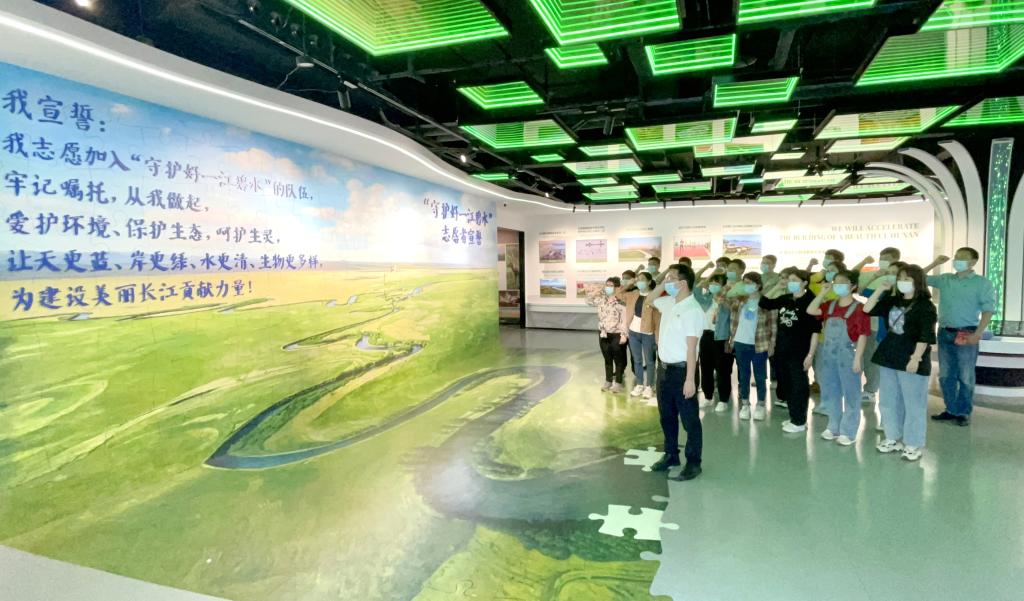 在展陈馆,大家先后参观了“长江·母亲之河”“习近平总书记情系长江”“守护好一江碧水”“逐梦·人类文明新形态”等4个主题展区。展览以图片、文字、影像等形式集中展示了岳阳碧水绕城、大江大湖的生态底色。在多媒体互动区,大家身临其境地体验到了近年来的生态治理成果,近距离感受了“候鸟的欢歌”“江豚的微笑”“麋鹿的倩影”。而在“守护一江碧水”志愿者宣誓墙前,大家庄严握拳宣誓——志愿加入“守护好一江碧水”队伍,为建设美丽长江贡献力量。