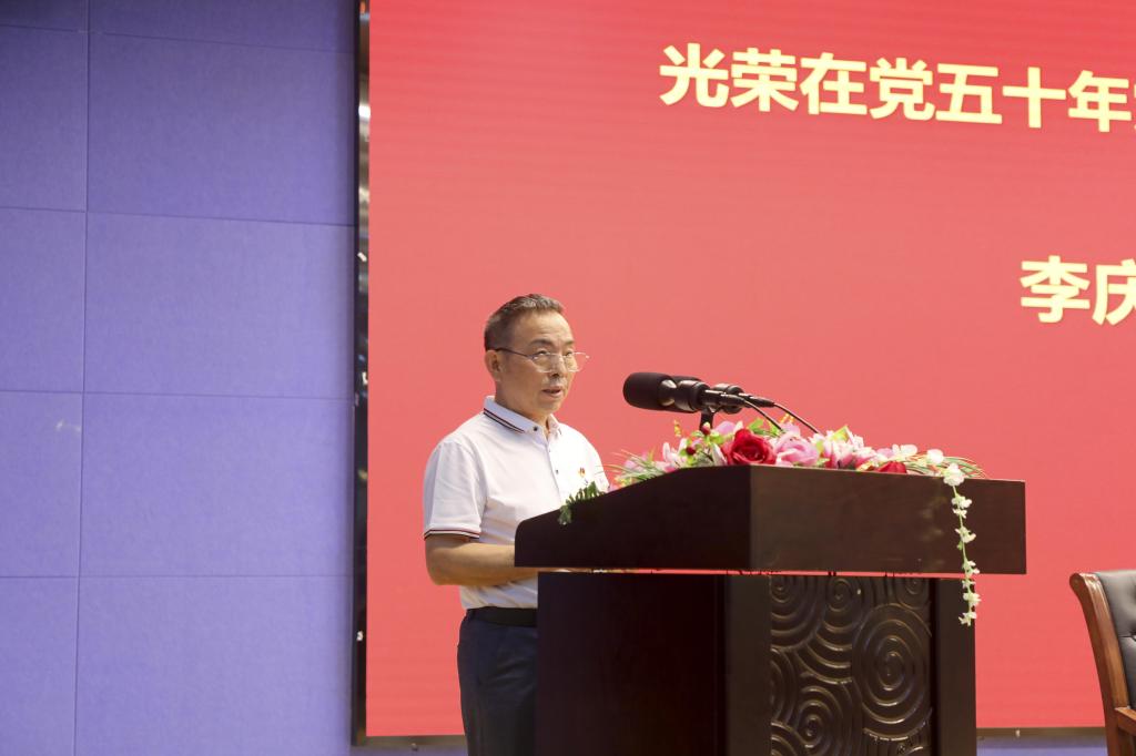 从2021年开始,党中央决定每年颁发“光荣在党50年”纪念章,今年学校退休党支部李庆许获此荣誉,雷放华为其颁发纪念章。李庆许深情讲述了自己与党的故事,收获现场掌声阵阵。会上,优秀党务工作者代表刘宝欣,先进基层党组织代表姚霞分别作交流发言。