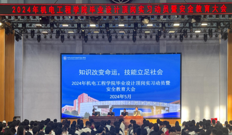 本网讯 为确保2022级学生实习工作顺利开展,帮助学生树立正确的实习观念、明确实习要求、做好实习前的各项准备,5月13日,机电工程学院在学校体育中心召开2024年毕业设计顶岗实习动员暨安全教育大会。机电工程学院院长王彪、党总支副书记赵晓东、副院长何湘龙、全体辅导员和2022级全体学生参加了本次大会。