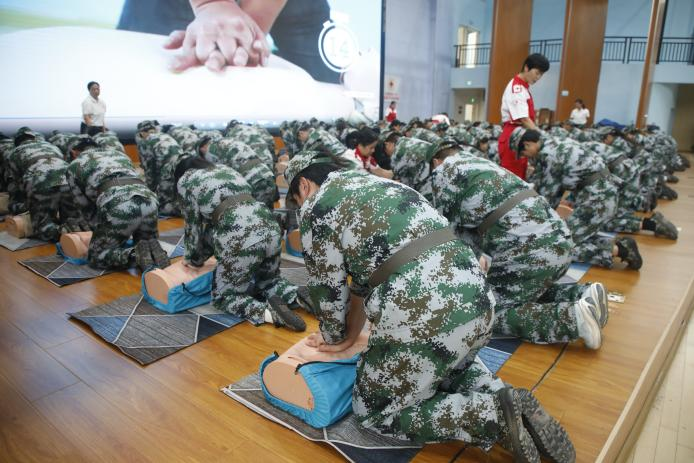 实操培训环节重点对心肺复苏实操进行练习和现场考核。为确保培训效果,岳阳市红十字应急救护志愿者协会提前准备了110套心肺复苏教具,并安排了20名专业培训师现场一对一指导。参训学生在培训师的带领下,认真练习、规范操作,现场秩序井然,学习氛围浓厚。