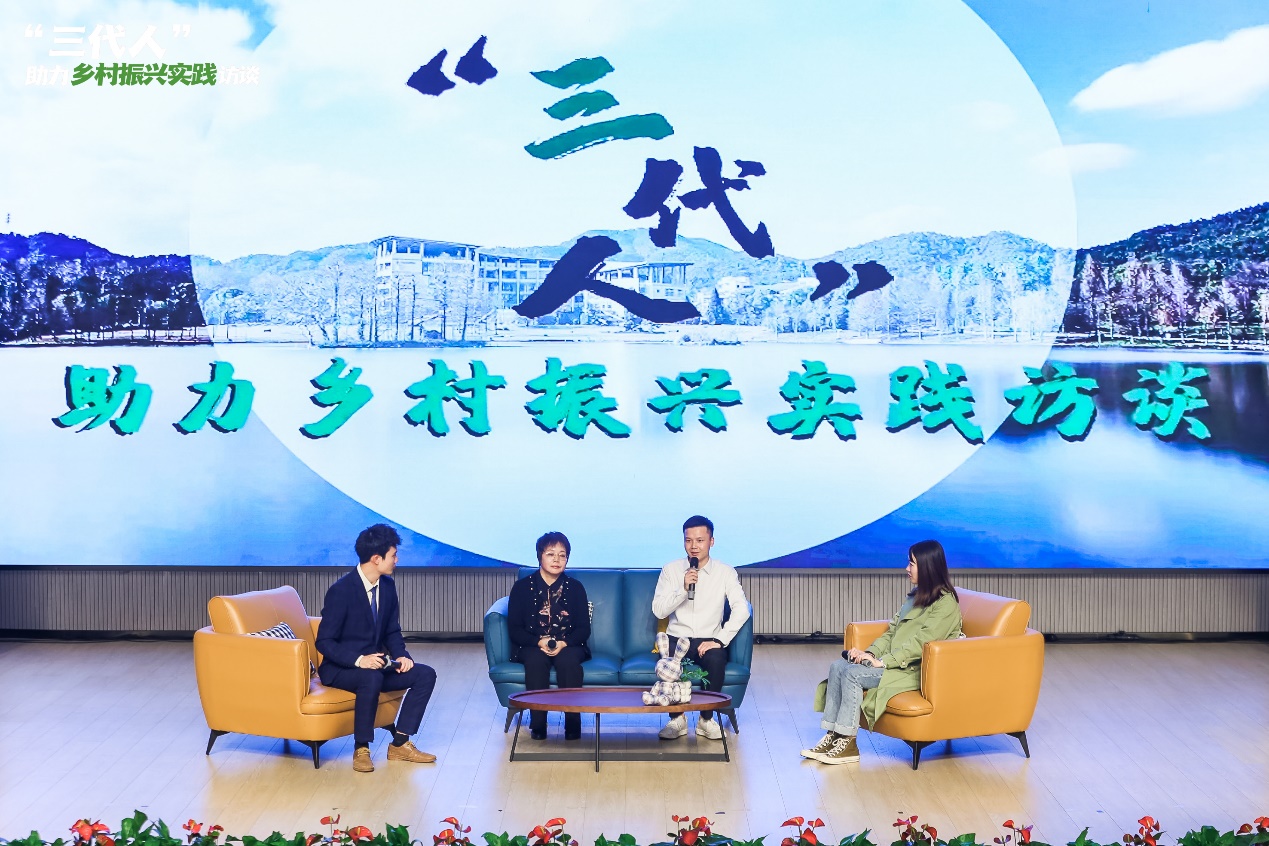 “三代人”助力乡村振兴实践访谈环节。邀请经管学院原林业经济管理省级重点学科方向负责人徐秀英,双枪集团董事兼副总、双枪创意设计有限公司总经理徐洪昌,余杭区农业农村局团委书记康佳宁,分享个人投身于农业农村经济发展的故事和经历感悟,进一步坚定了经管师生投身“三农”事业的情怀与信念。