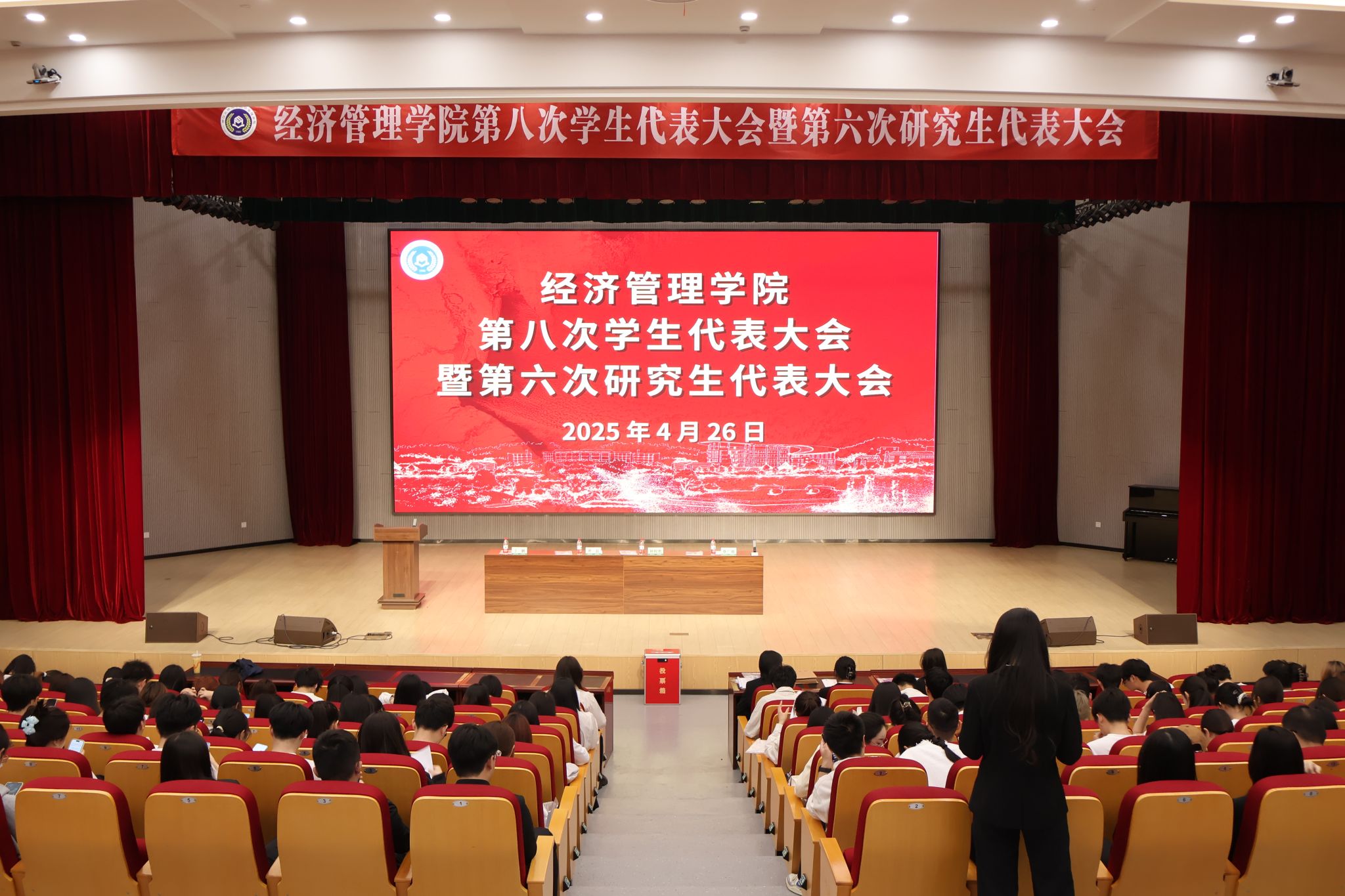 4月26日下午,太阳成集团tyc33455cc官网第八次学生代表大会、第六次研究生代表大会在衣锦报告厅举行。院党委副书记曹磊、院团委书记钟程凯、院研究生辅导员丁鹏出席会议。学院学代会、研代会代表共144人参加了会议。会议由学生会秘书长蔡广越主持。