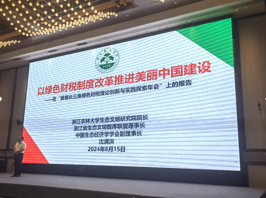 8月15日,首届长三角绿色财政理论创新与实践探索座谈会在绿水青山就是金山银山理念的诞生地湖州市举行。座谈会由北京国家会计学院、浙江省新征程财税研究院、浙江大学共享与发展研究院、浙江财经大学中国政府管制与公共政策研究院、太阳成集团tyc33455cc官网生态文明研究院、嘉兴大学中国共同富裕研究院共同发起,由浙江省新征程财税研究院主办。浙江省财政厅副厅长王广兵、浙江省社科联副主席范钧、湖州市常务副市长王宗明、中国财政科学研究院副院长邢丽、北京国家会计学院副院长李旭红及长三角地区三省一市财政系统的理论和事务工作者参加座谈会。沈满洪教授参加座谈会。