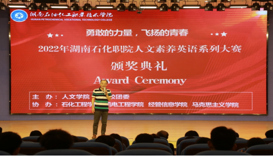 (通讯员赖鹏丽欧阳懿璐)6月8日,由人文学院和校团委主办,石化工程学院、机电工程学院、经管信息学院、马克思主义学院协办的2022年湖南石化职院人文素养英语系列大赛颁奖典礼在德远楼学术报告厅隆重举行。教务处处长黄丹群、经管学院院长刘顺清、石化工程学院党总支副书记隗小山、马克思主义学院党支部副书记陈辉、人文学院院长王列明、书记熊伟,还有各位英语老师们均出席典礼并为获奖选手颁奖。